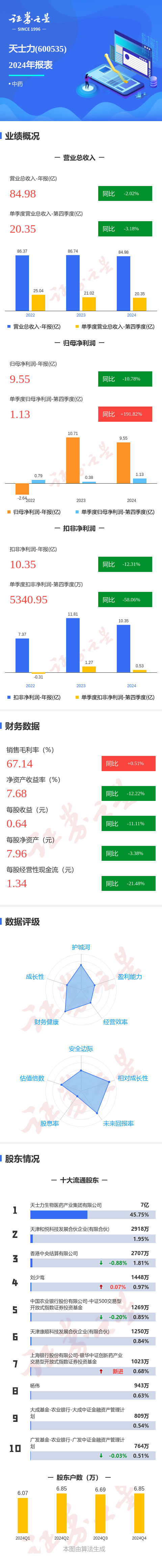 证券之星消息,天士力2024年年报显示,公司主营收入84.98亿元,同比下降2.03%;归母净利润9.56亿元,同比下降10.78%;扣非净利润10.36亿元,同比下降12.31%;其中2024年第四季度,公司单季度主营收入20.36亿元,同比下降3.19%;单季度归母净利润1.13亿元,同比上升191.83%;单季度扣非净利润5340.96万元,同比下降58.06%;负债率19.13%,投资收益-8439.9万元,财务费用-2517.7万元,毛利率67.14%。